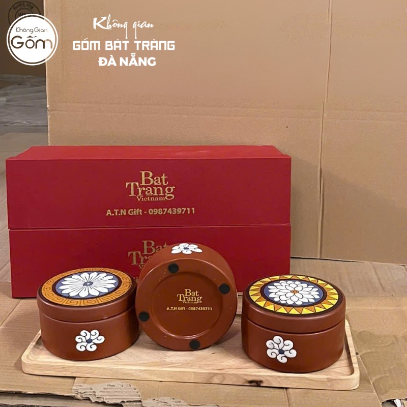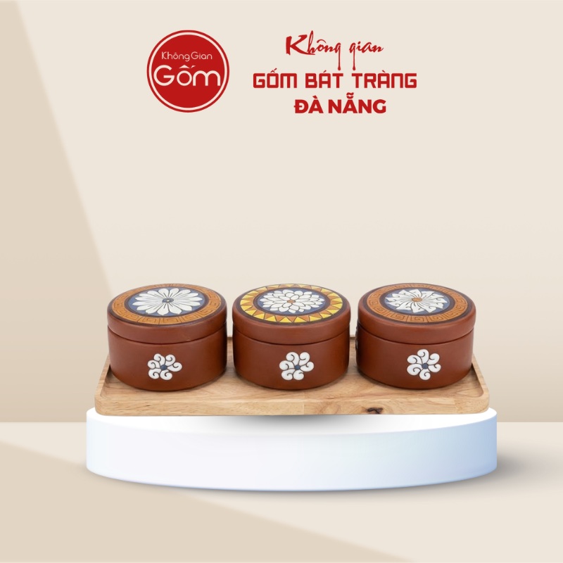 - Bộ sản phẩm hoàn chỉnh: Bao gồm ba hộp gốm sứ dáng hũ tròn có nắp đậy kín đáo và một khay gỗ tự nhiên, thiết kế đồng bộ mang lại sự tiện nghi và vẻ đẹp hài hòa cho không gian trưng bày.