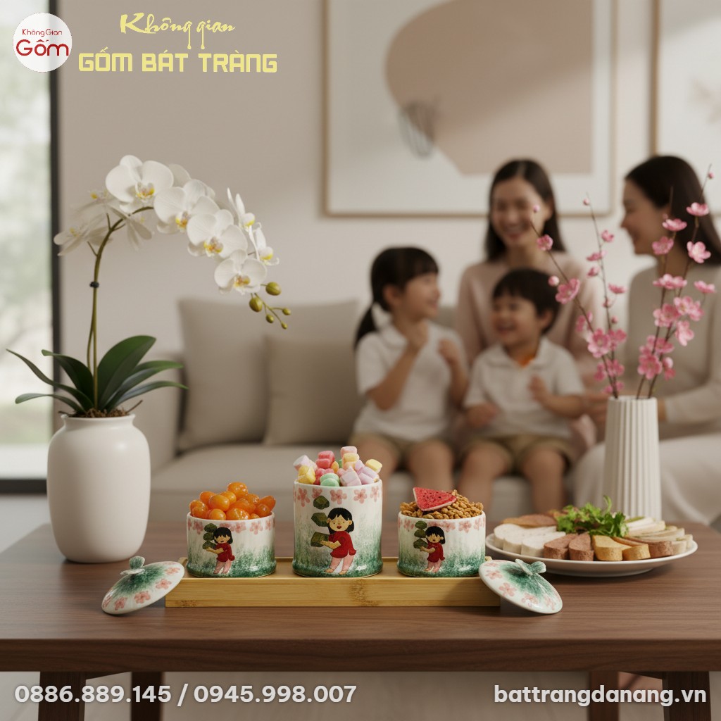 - Chất liệu cao cấp: Gốm sứ Bát Tràng nung ở nhiệt độ cao, đảm bảo độ bền vượt trội và an toàn tuyệt đối cho sức khỏe người dùng khi đựng kẹo mứt.