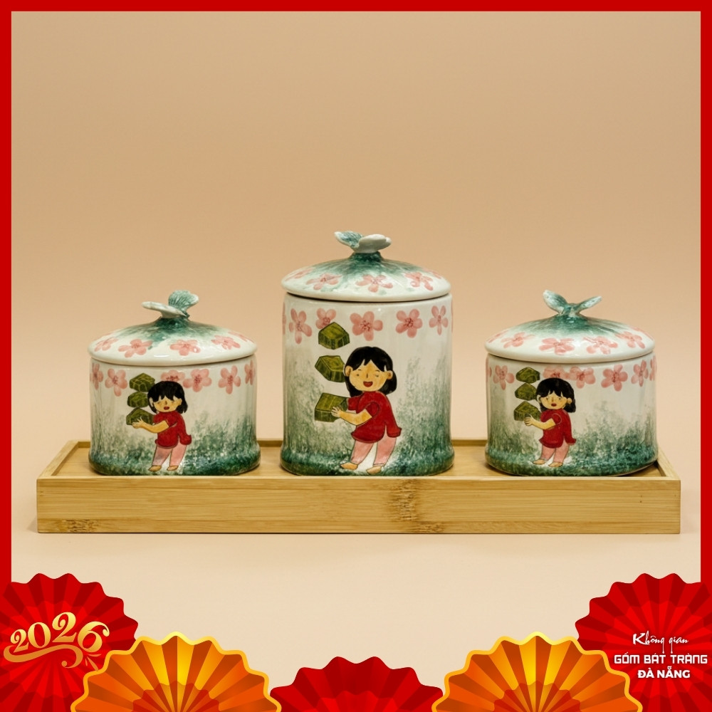 Toàn cảnh Bộ Khay Mứt Tết Gốm Sứ Vẽ Tay Cô Gái Chúc Xuân BT-HM40 trên khay gỗ mộc mạc.