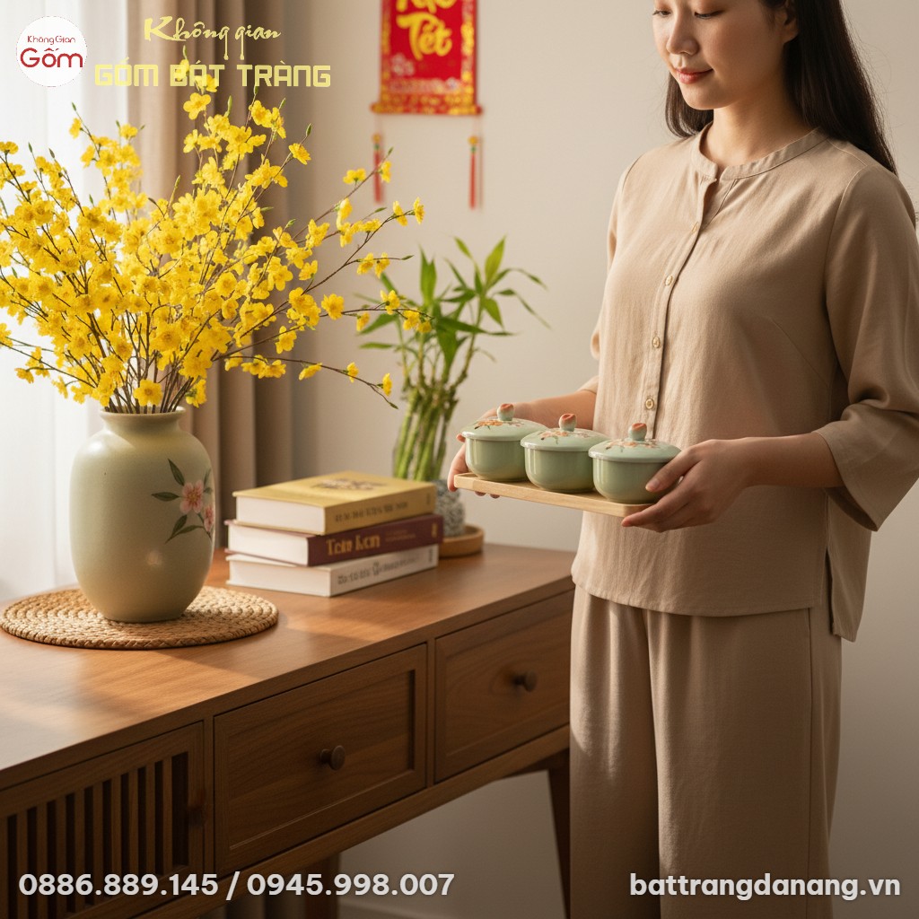 Giữa muôn vàn vật phẩm trang trí Tết đậm đà bản sắc văn hóa Việt, khay mứt Tết luôn giữ vị trí tâm điểm, là nơi ươm mầm những câu chuyện sum vầy và khởi đầu một năm mới an lành. Bộ sản phẩm BT-HM22 tự hào là sự hòa quyện tinh tế giữa nghệ thuật chế tác gốm sứ thủ công Bát Tràng và nét đẹp hiện đại, kiến tạo giá trị bền vững cùng vẻ đẹp lay động lòng người.