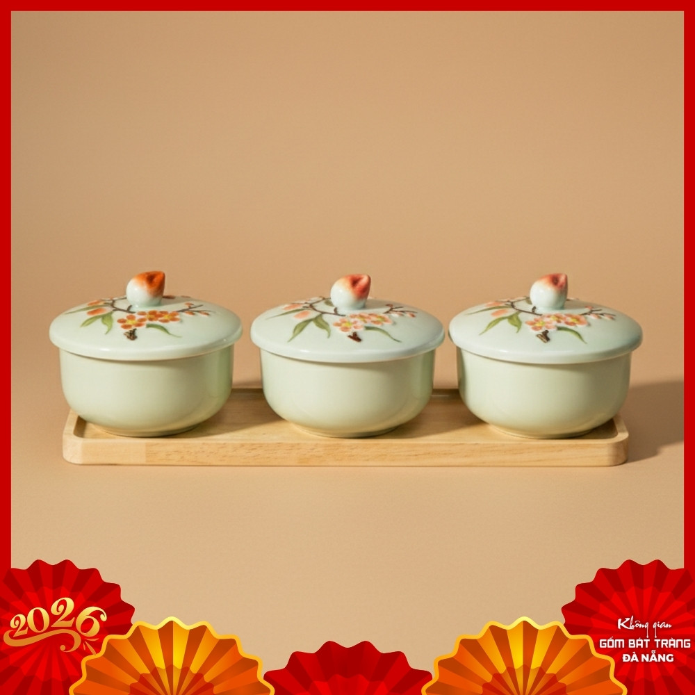 Toàn cảnh Bộ 3 Hộp Khay Mứt Tết Men Ngọc Họa Tiết Hoa Đào trên khay gỗ.