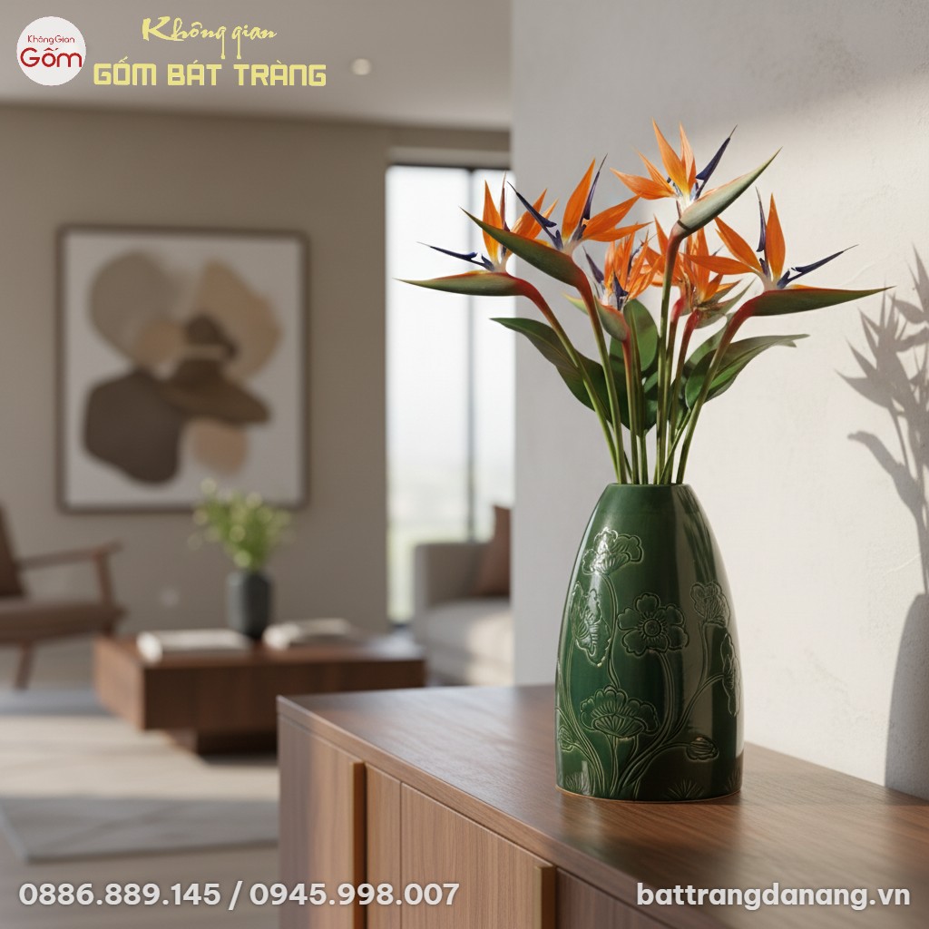 Chúng tôi nhiệt liệt chào đón quý khách tại Đà Nẵng ghé thăm hai showroom của chúng tôi để có trải nghiệm chân thực nhất về Lọ Hoa Dáng Chuông Men Xanh Khắc Hoa Gốm Bát Tràng BT-BH145 và hàng ngàn sản phẩm gốm sứ Bát Tràng chính gốc khác. Quý khách có thể cảm nhận trực tiếp chất men, chạm vào từng đường nét khắc họa và hình dung sản phẩm trong không gian sống của mình.