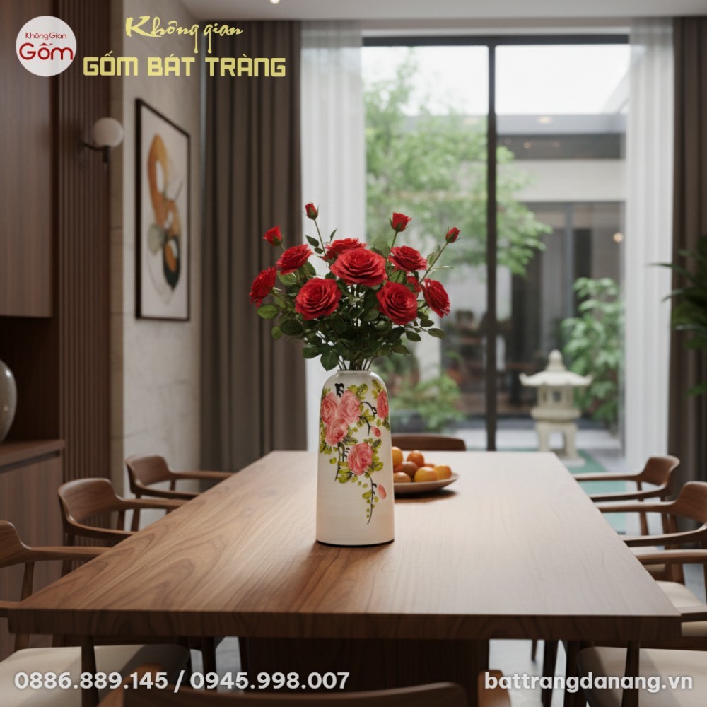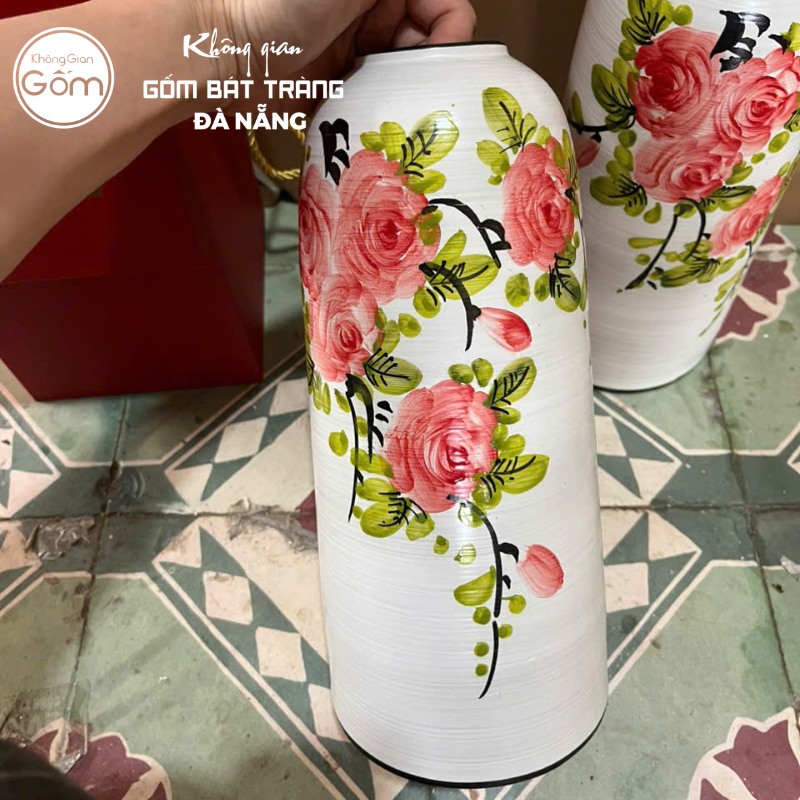 Tổng quan lọ hoa dáng ống men trắng với họa tiết hoa hồng đỏ vẽ tay thủ công.