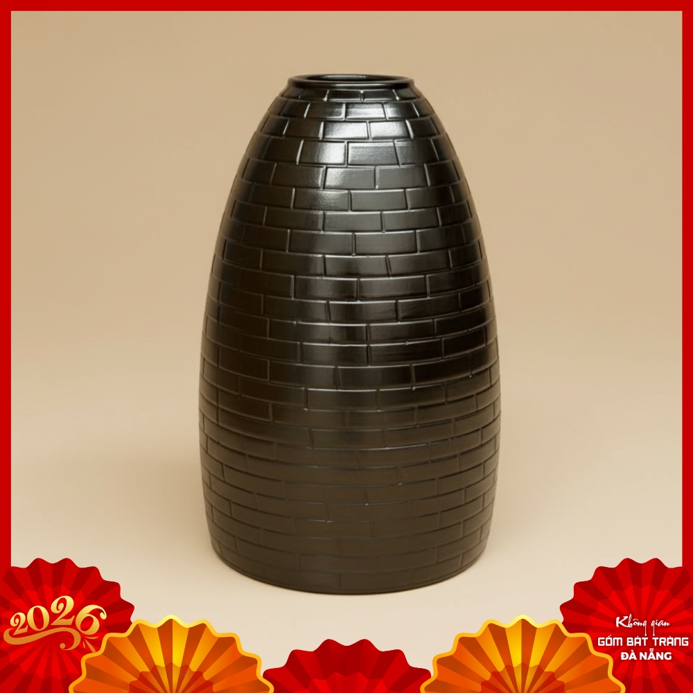 Lọ Hoa Men Đen Họa Tiết Vân Gạch Dáng Chuông BT-BH155