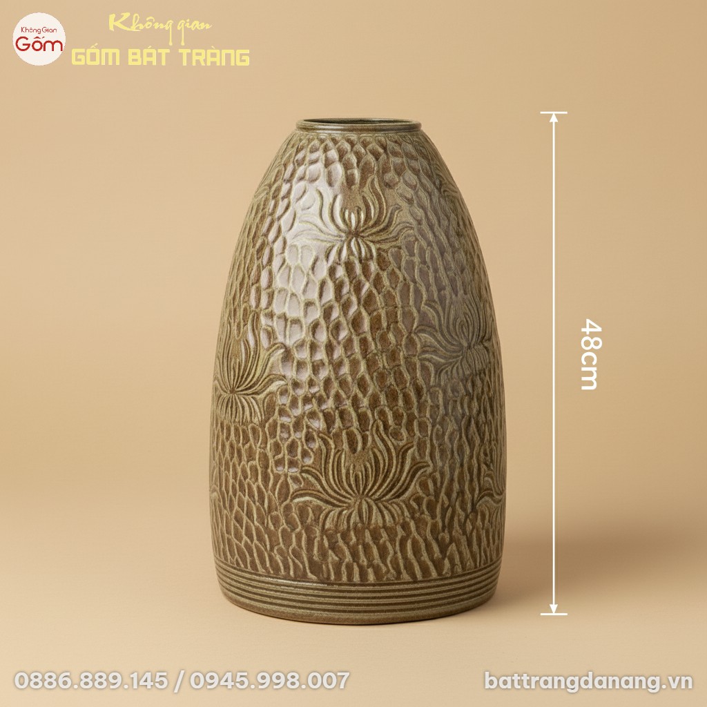 Lọ Hoa Men Nâu Họa Tiết Hoa Sen Dáng Chuông Bát Tràng BT-BH151 là sự kết hợp tinh tế giữa vẻ đẹp hoa sen thanh khiết và men nâu đất mộc mạc. Từng đường nét chạm khắc thủ công tỉ mỉ trên dáng chuông vững chãi, mang đến một tác phẩm nghệ thuật độc đáo cho không gian sống. Hoàn hảo để cắm các loại hoa cao, tạo điểm nhấn phong thủy và trang trí nội thất thanh lịch.