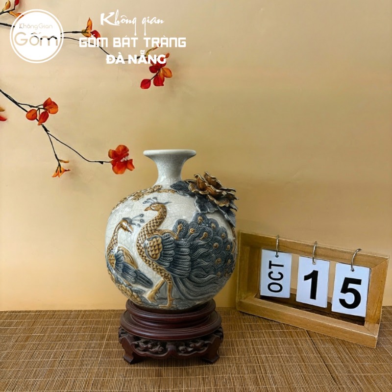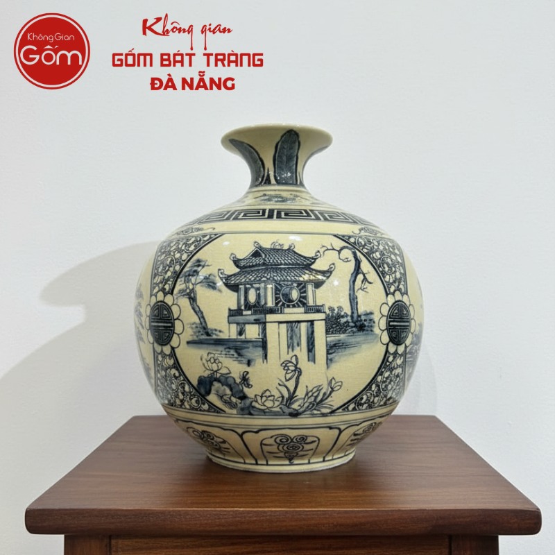 Toàn bộ họa tiết trên bình đều được thực hiện thủ công bởi đôi bàn tay khéo léo của các nghệ nhân Bát Tràng dày dặn kinh nghiệm, đảm bảo mỗi đường nét đều sống động và có hồn. Các dòng men như men lam, men rạn hay kỹ thuật vẽ vàng kim 24K càng làm tăng thêm giá trị và tính thẩm mỹ cho vật phẩm.